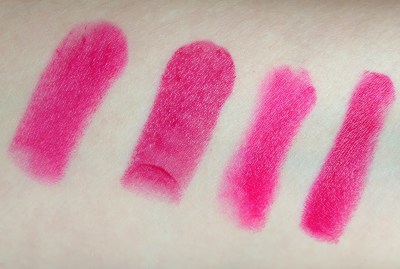 In a recent meeting of my dissertation committee, one of my advisers counseled me, in an inadvertently sexual phrase, to “find the hole in human knowledge that your project is going to fill.” I think that advice holds true for lipstick collections, too, though I’m deep enough (ahem) in my addiction that I can almost always justify a new purchase: “Oh, but this pinky-red coral is matte and the one I have at home is only semi-matte!” Below, you can see (sort of) the hole that Raspberry Pie fills in my library of fuchsias. Left to right: Revlon Fuchsia, Raspberry Pie, Maybelline Vivid Rose, and Revlon Cherries in the Snow.
