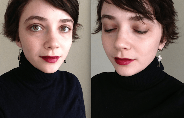 Side-by-side face swatches: again, Revlon on the left and NYX on the right. I always end up wearing a dark lipstick with this turtleneck; I like the ’90s vibe.
