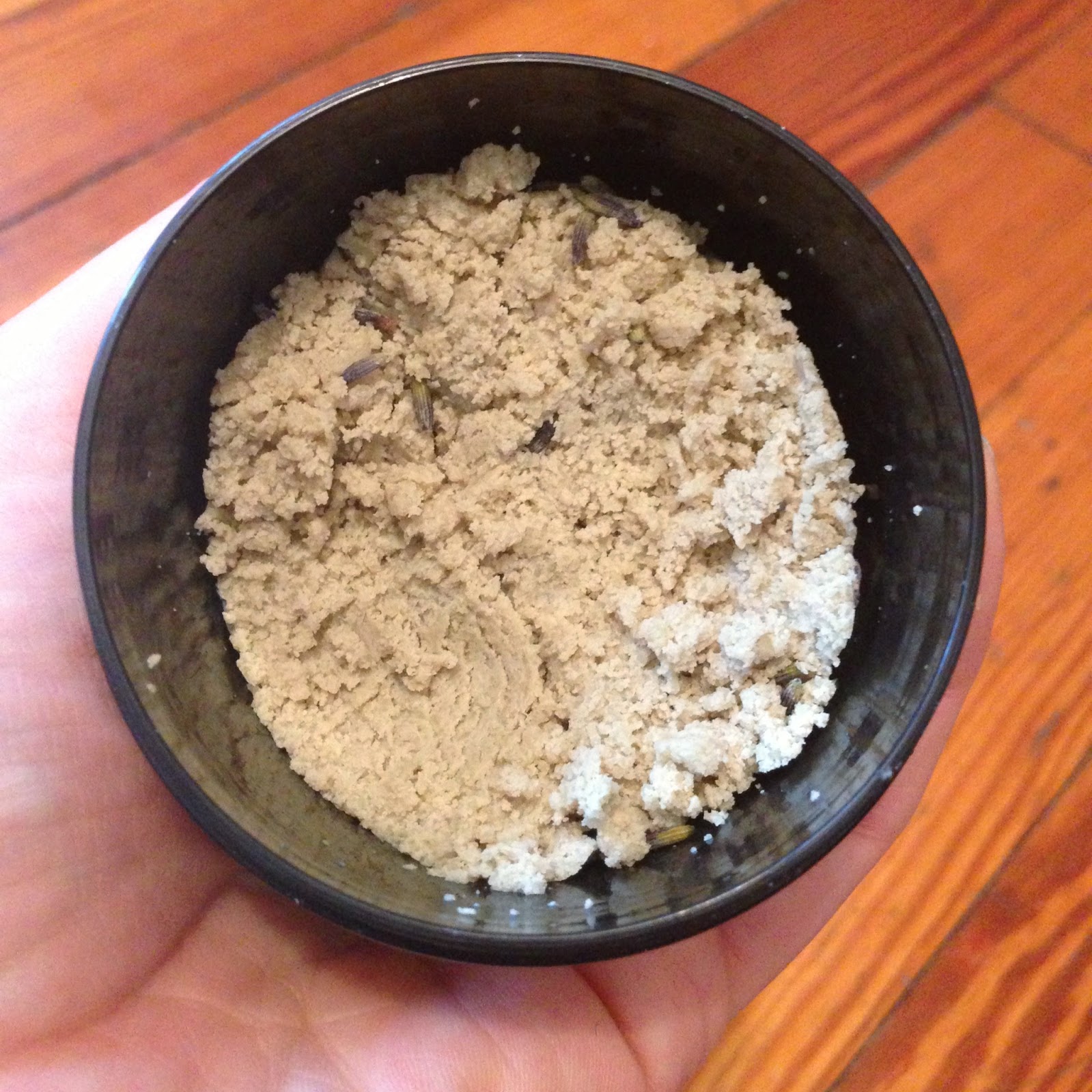 Angels on Bare Skin is a dry, crumbly paste of ground almonds, glycerine, kaolin clay, and various essential oils, primarily (and, scent-wise, predominantly) lavender. It’s an example of what Lush does best: quirky, unusual skincare products that require you to get a little messy. Or, in this case, very messy. Put your hair back, for the love of God (I like to use Angels just after a shower, when all my hair is up in a towel). Pinch out a pea-sized amount of Angels with dry hands, as moisture in the jar will hasten spoilage. Mix in a few drops of water to form a paste. Rub this paste all over your face; some will get stuck in your hair and eyebrows, despite your best efforts. I like to leave the paste on my face for a minute or two, to let the kaolin draw out impurities: