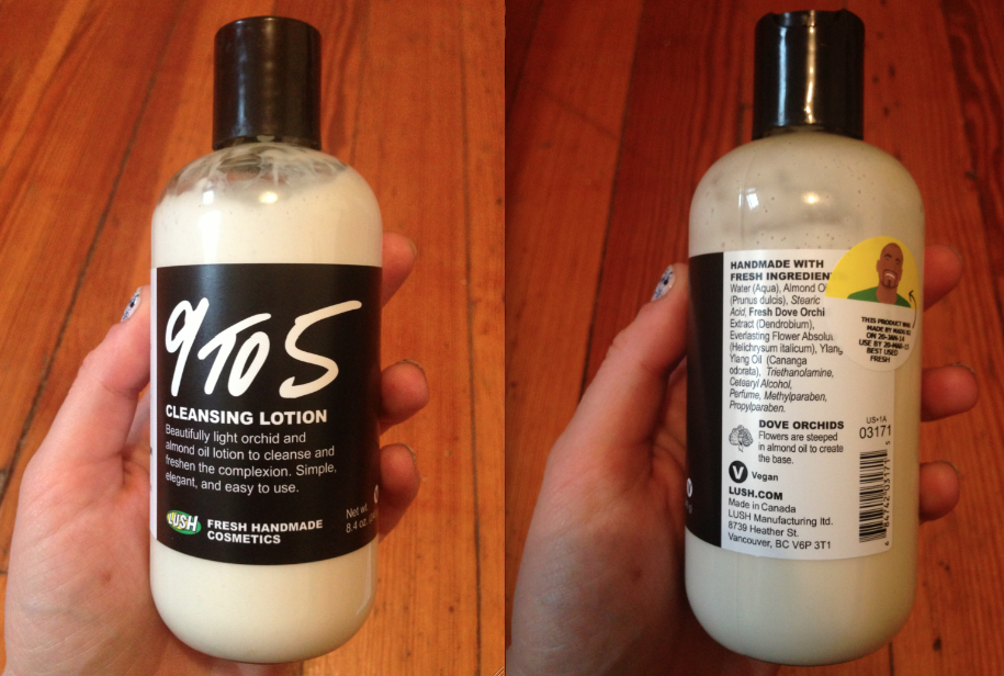 My love for this product amuses me, since I went straight from college to graduate school and have never worked a 9-to-5 job in my life. 9 to 5 is a thin, milky lotion; I massage it into damp skin and wipe it off with a moist washcloth, and it leaves my skin feeling far less dry than traditional foaming cleansers do. It also does a good job of removing my makeup, though I don’t tend to wear a lot of eye makeup and I wouldn’t trust it to get rid of an elaborate smokey eye. It has a delicate floral smell that I find pleasant but a little old-ladyish–I’m not a huge fan of Lush’s floral scents. I use this lotion twice a day, when I wake up and after I come home in the evening.