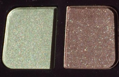 So! On the left, we have a frosty pale green that looks alternately like mint, sage, and icy aquamarine. On the right, we have a semi-matte plum shot through with silvery green glitter. The green shade is smooth and rich, blending like a dream; the plum shade is sheerer, more patchy, and harder to blend, though it works fine over a primer.