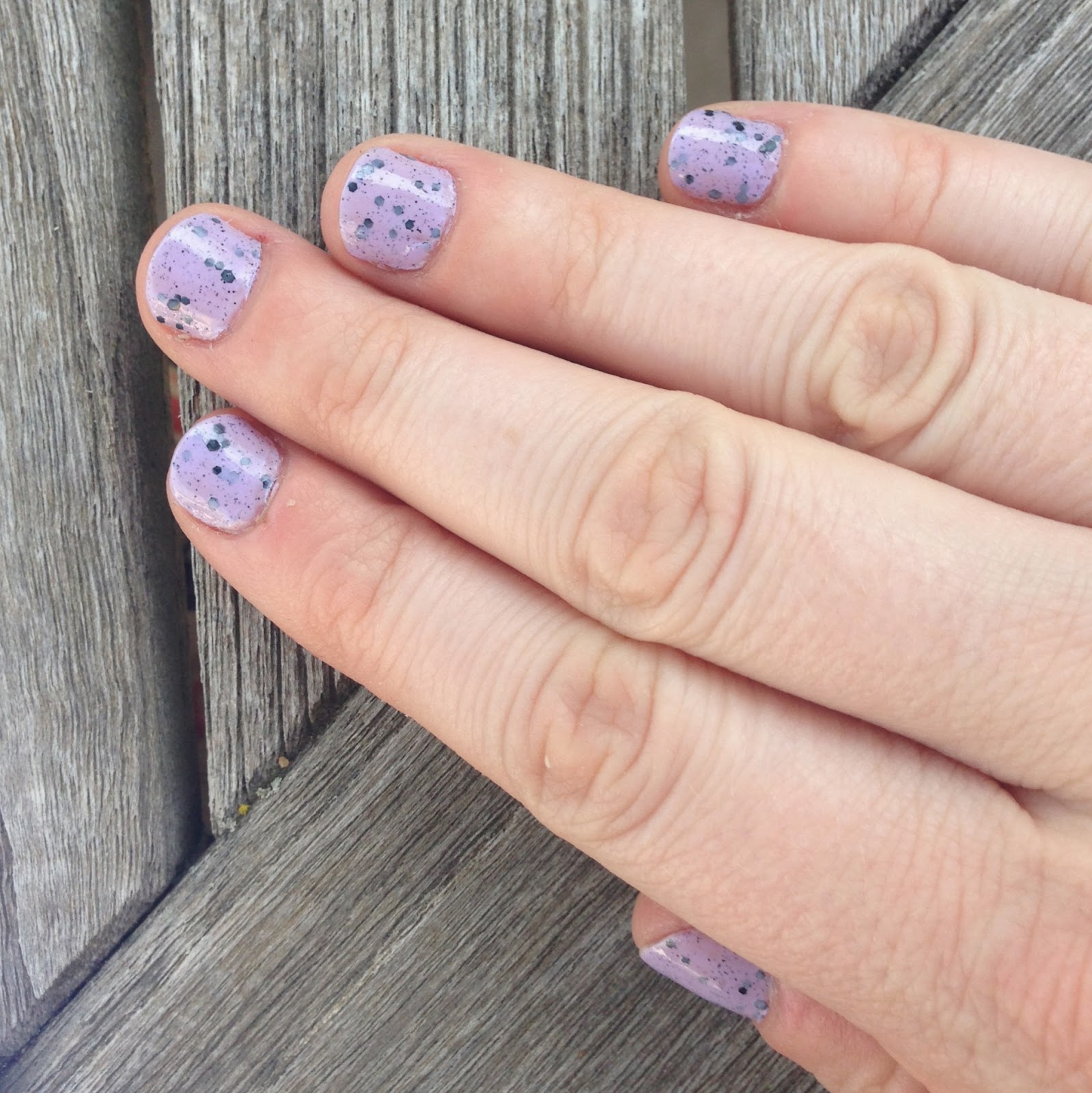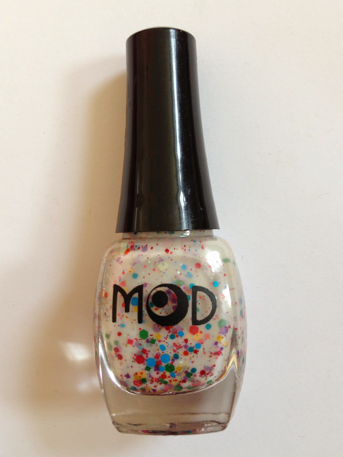 I was all set to complain about the formula, which is very sheer and too watery to suspend the larger glitter bits properly; the glitter sinks to the bottom, requiring a painstaking shake-fish-dab process. But ModLacquer has apparently reformulated Nonpareils since I bought it last summer, and now it “has more white so it’s less transparent than the previous formula.” I don’t know if this means it’s also thicker, but more opacity is definitely a step in the right direction. Incidentally, Nonpareils reminds me of China Glaze It’s a Trap-eze, reviewed here by Sleep and Water; the obvious difference is that the glitter in Nonpareils is a lot more sparse.