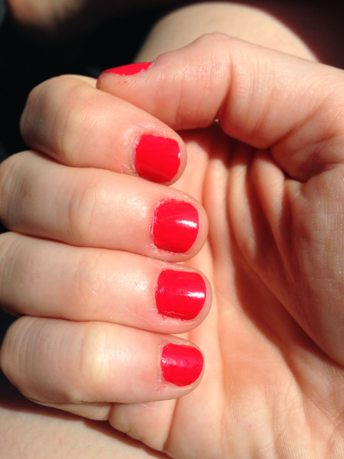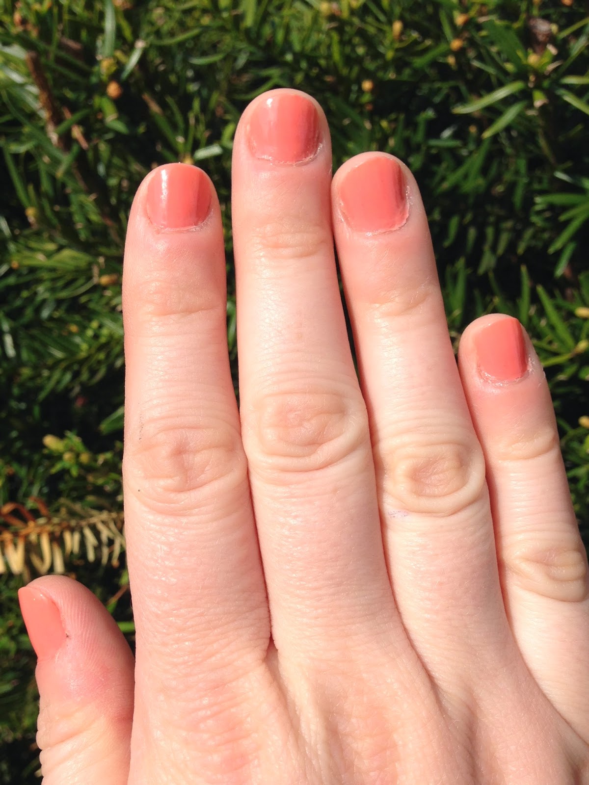 It turns out that I own a near-dupe with a longer-wearing formula: Essie Come Here!, from the 2013 resort collection. Come Here! is a lighter, pinker coral than Tapage, but on the nails, especially in direct sunlight, it looks almost identical: