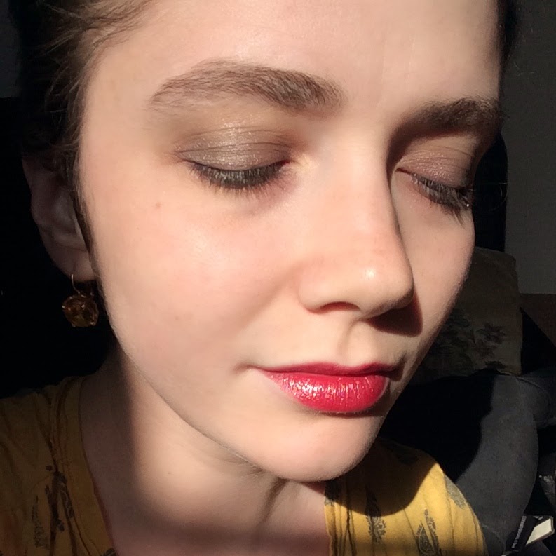 Had I glanced at Ruby Star under drugstore lighting, I would have muttered the F-word–frost–and moved on. But having seen it in direct sunlight, I’m reluctant to call it a frost lipstick; I think of frost as white or silver, with smaller, finer particles. Though Ruby Star’s base color is cool-toned, the gold glitter warms it up significantly, and the glitter bits are large enough that they never meld together into a frosty sheen. Or maybe I’m just lying to myself, clinging to old prejudices, trying to justify a love that dare not speak its name–and last dared speak it in 1991. Frost.