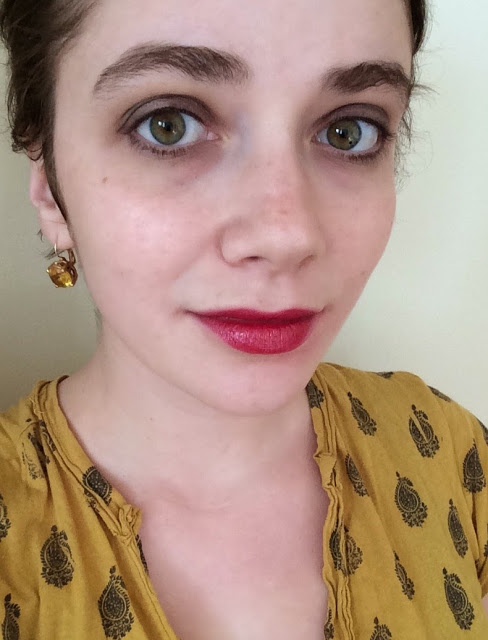 Ruby Star’s texture is emollient but gritty; you can really feel all that glitter going on. I have dry lips and deep lip lines, and I find that the texture emphasizes both. I don’t mind very much (if I’m wearing this lipstick, I’ve already put self-consciousness aside), but it’s something to keep in mind. Also, the slick formula makes the color blur and feather at the edges, which almost never happens to me; a lip liner would be useful here. But let’s ignore such things and focus on the astonishing fact that this lipstick comes from a drugstore brand, not an indie company that names all its products after post-apocalyptic teen novels. (Just to clarify, I don’t mean that as an insult. Far from it.)