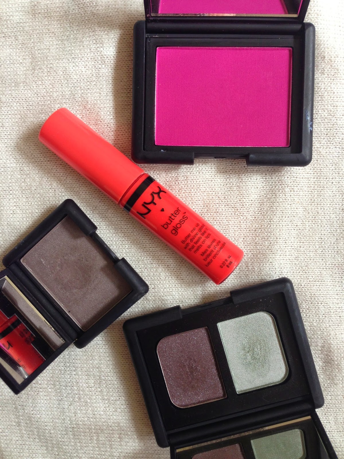 Top to bottom: NARS Coeur Battant blush (limited edition for Holiday 2013, tragically), NYX Butter Gloss in Peach Cobbler, NARS Lhasa (in future I’ll try to limit the Lhasa overexposure on this blog), NARS Habanera eyeshadow duo. You saw this look in the second photo in this post, but here’s a better look at the eyes: