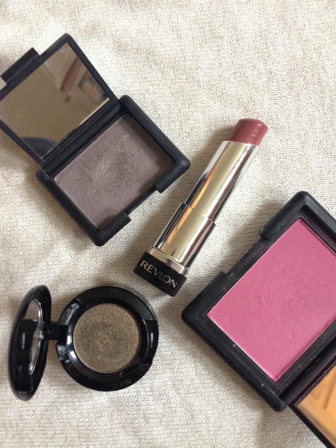 Clockwise from top left: NARS Lhasa eyeshadow, Revlon Pink Truffle lip butter, NARS Mata Hari blush, and NYX After Party eyeshadow. You may be wondering about the sudden return of After Party, which I reviewed negatively in a recent post. The explanation: sheer laziness. I never got around to returning any of the three NYX eyeshadows I ordered back in March, and when I finally tried them again, I was surprised at how well they applied and blended over primer. Still on the dry and powdery side, but good enough.