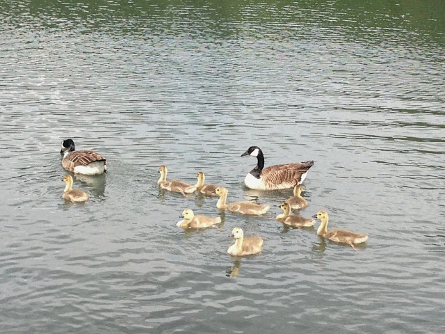 I promised you goslings, and I intend to provide. On Sunday, we took a walk along a canal built in 1792, ending up at a lake on the university campus, where we saw two geese with nine goslings: