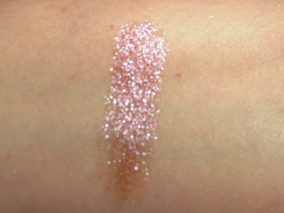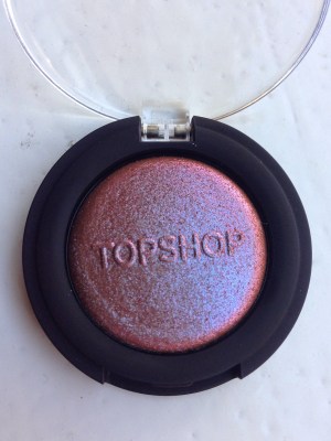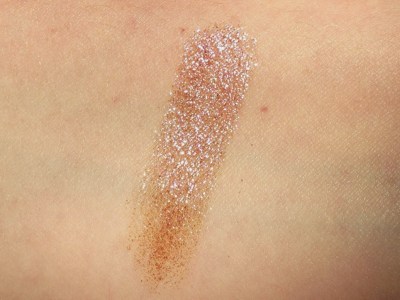 First up is the Chameleon Glow, which Topshop describes as an “[a]mazing dual pigmented, multi-use powder; can be used as an eyeshadow or a facial highlight.” It’s a translucent duochrome powder that’s slightly rough to the touch. I saw two colors of this product on the shelf at Topshop: U-Turn was a peach/lime duochrome, while Wax + Wane has a brown-bronze base with fuchsia and electric blue overlay. I liked U-Turn as well, but it was less opaque than Wax + Wane. The Chameleon Glows are part of Topshop’s summer Festival Collection, which also contains four pots of loose chunky glitter. Something tells me that twenty-six-year-old literature grad students might not be the target demographic for this collection.