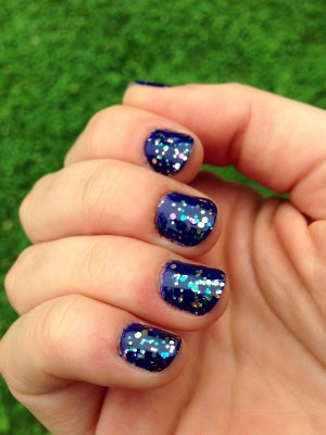 I count five colors of glitter: blue, green, orange, fuchsia, and gold. For my first layering attempt, I wore it over OPI Eurso Euro, a dark cobalt, and must have taken at least 20 photos of my nails in the next few days. SO PRETTY.