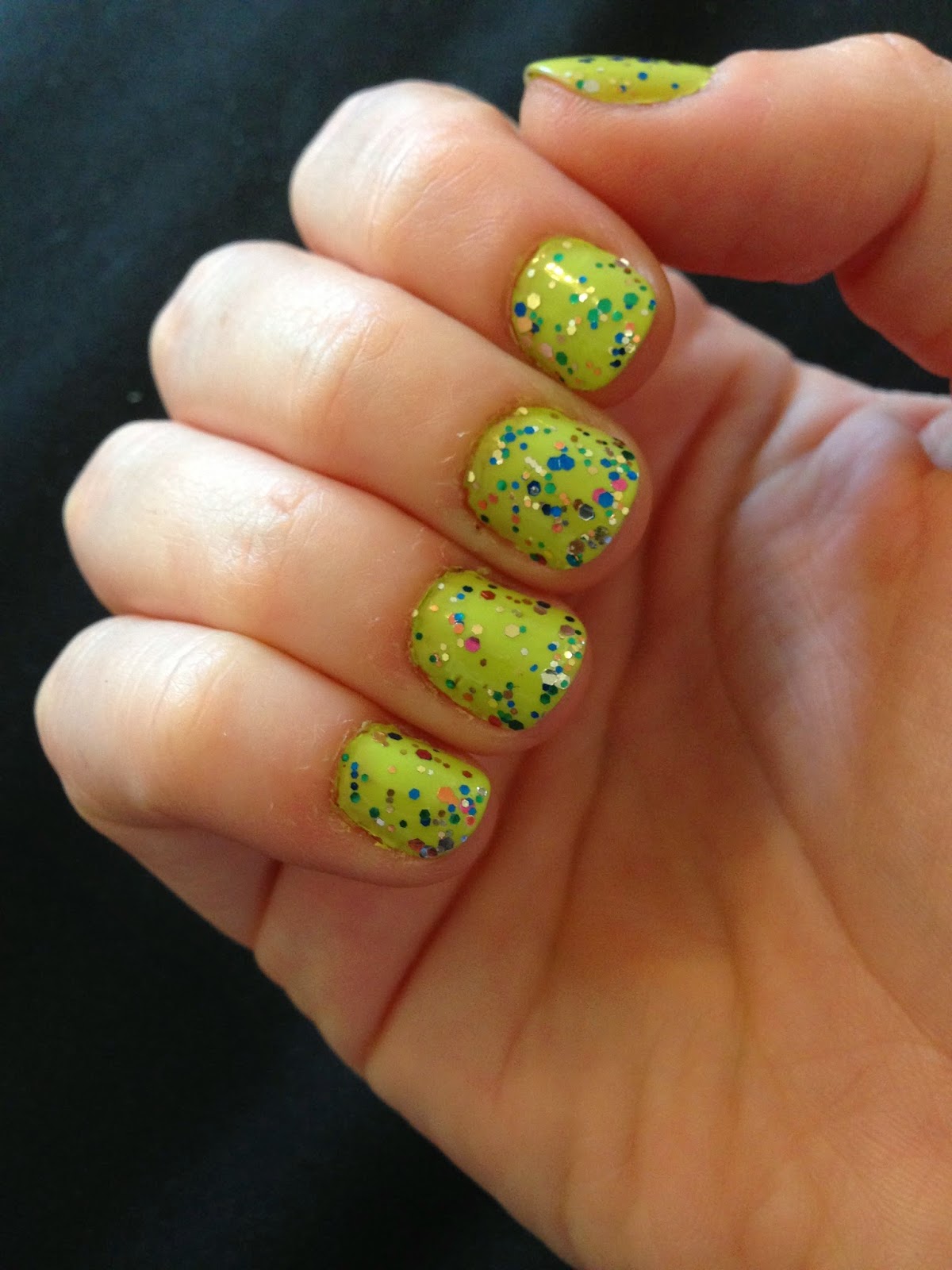 I’m much more enamored of Brazil (three cheers for accidental World Cup allusions, and also for the American victory last night!). Brazil is a glitter topcoat in a clear base; one coat delivers a generous, evenly spaced helping of glitter. As I’ve mentioned before, most glitter topcoats look a little too Christmassy for my taste, but Brazil can’t be mistaken for anything but summer in a bottle.