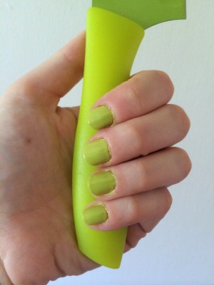 The first one I bought, Clique, is a bright avocado green that happens to match my bread knife perfectly, because I’m foppish enough to own a chartreuse bread knife. I don’t know what sort of clique Topshop meant to evoke with that name. The clique of people who have Pinterest boards devoted to chartreuse-heavy ’60s and ’70s graphic design? Anyway:
