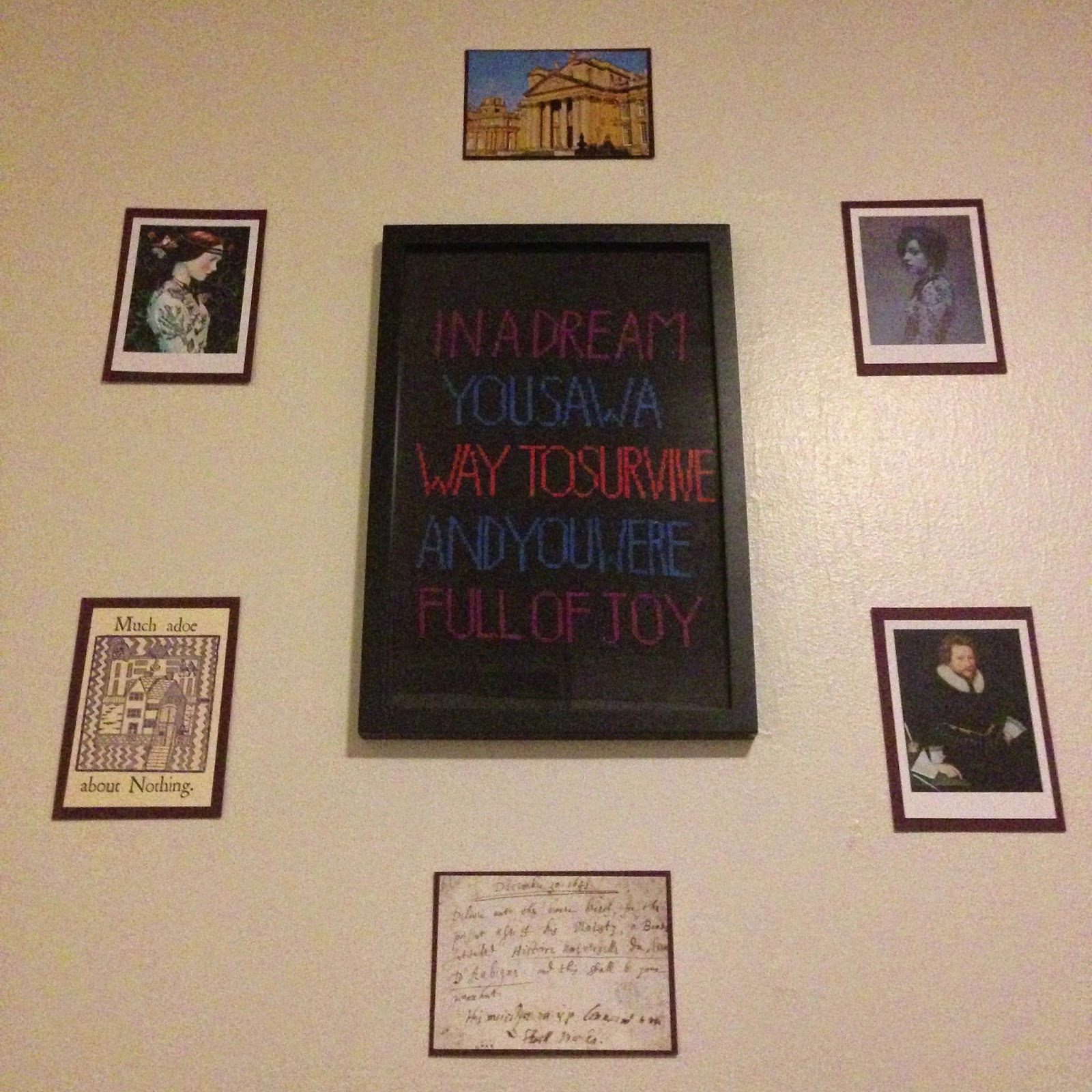 Since returning from England five days ago, I’ve been in full-on home- and self-improvement mode. I’ve cleaned, dusted, exercised, gotten rid of the too-small college clothes that have been following me from apartment to apartment since 2009, and re-hung the Jenny Holzer-inspired cross-stitch piece I finished earlier this year. (I was too arrogant/lazy to use letter stencils, so I freehanded the whole thing, and you can see the consequences. Damn it.) I also classed up some postcards from England by giving them burgundy card-stock “frames.” I’m such a product of Pinterest it hurts. Can I call this my “gallery wall”?