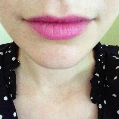 I’ve now tried five MAC lipstick formulas–Matte, Amplified Creme, Satin, Cremesheen, and Lustre– and Satin has to be my favorite. It’s a semi-matte formula lying somewhere between Amplified Creme, which is so soft and creamy that it has next to no lasting power, and Matte, which can be drying. Pink Nouveau is fully opaque and lasts several hours, but it sits comfortably on my lips and wears off evenly. It also looks good with polka dots.