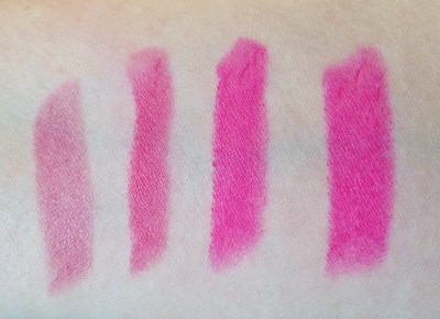 I made some comparison swatches to give you an idea of how bright, yet how un-fuchsia, Pink Nouveau really is. Left to right: Maybelline Make Me Pink (lighter, sheerer, cooler), Pink Nouveau, Maybelline Fuchsia Flash (darker, brighter, glossier), and MAC Candy Yum-Yum (darker, brighter, more matte).
