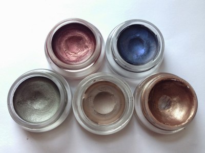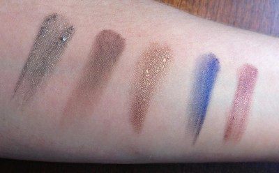 Here are some swatches to give you an idea of the significant textural differences. Left to right: Audacious Asphalt (audacious only in its resistance to blending), Tough as Taupe, Bad to the Bronze, Electric Blue, and Pomegranate Punk. Keep in mind that I bought Bad to the Bronze over a year ago, so it’s not quite as smooth and buttery as it once was. Still going strong, though.