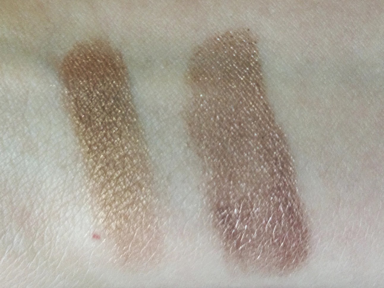 Swatched with theBalm Seductive to illustrate how cool-toned it is for a bronze. Bad to the Bronze is the one on the right; it looks almost copper next to the yellow-bronze Seductive, which I rarely use.