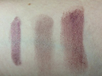 I seem to be drawn repeatedly to red-based purples; I find that they bring out the green in my eyes. Left to right: NYX Jewel, right-hand shade of NARS Habanera duo, and Pomegranate Punk.