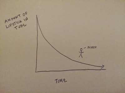 Reason for neglect: One of the governing laws of cosmetics is that the closer you come to finishing a product, the longer it manages to stretch itself out. Put another way, an empty lipstick tube is the most tragic of asymptotes, as illustrated in this extremely technical graph: