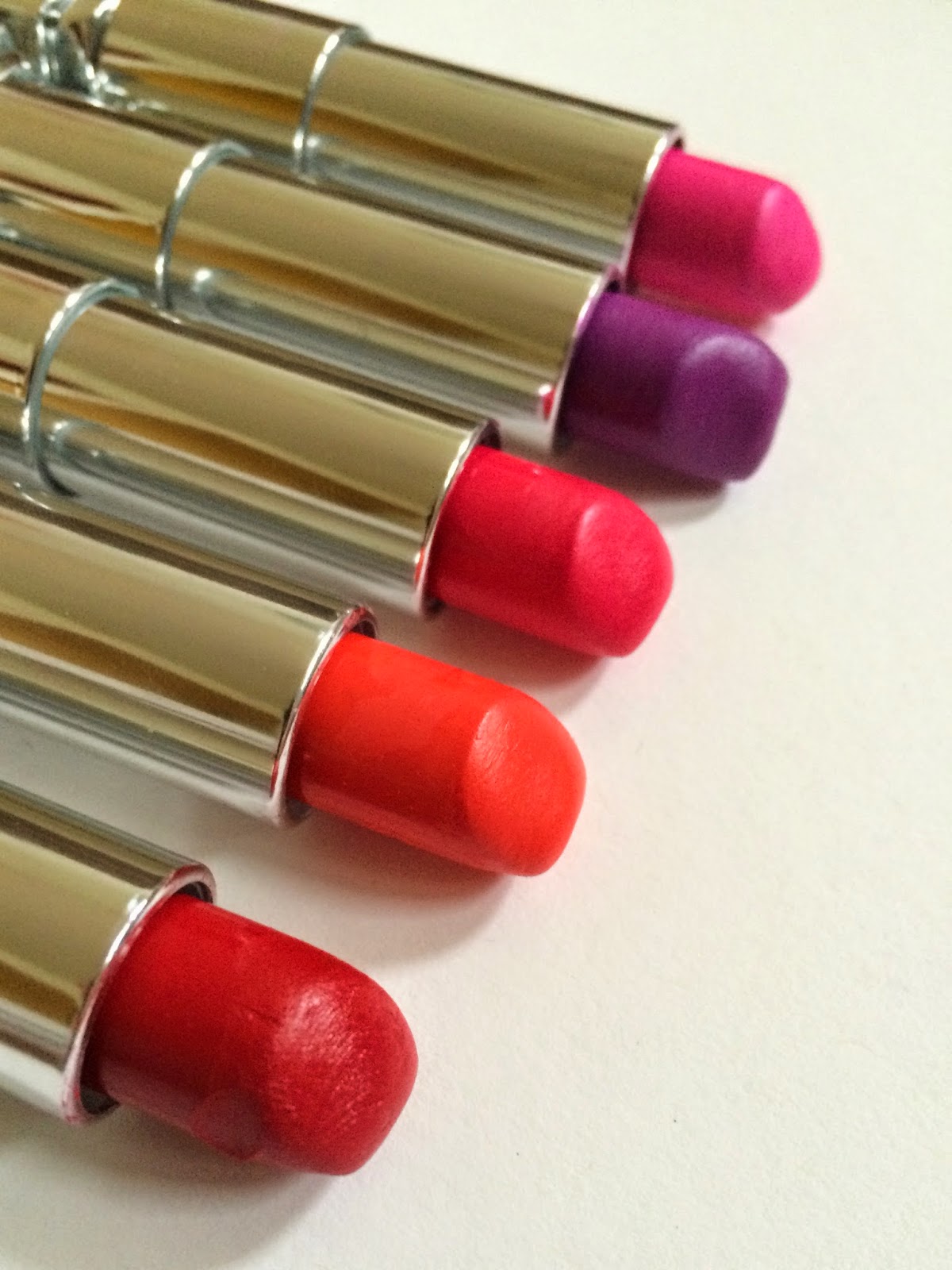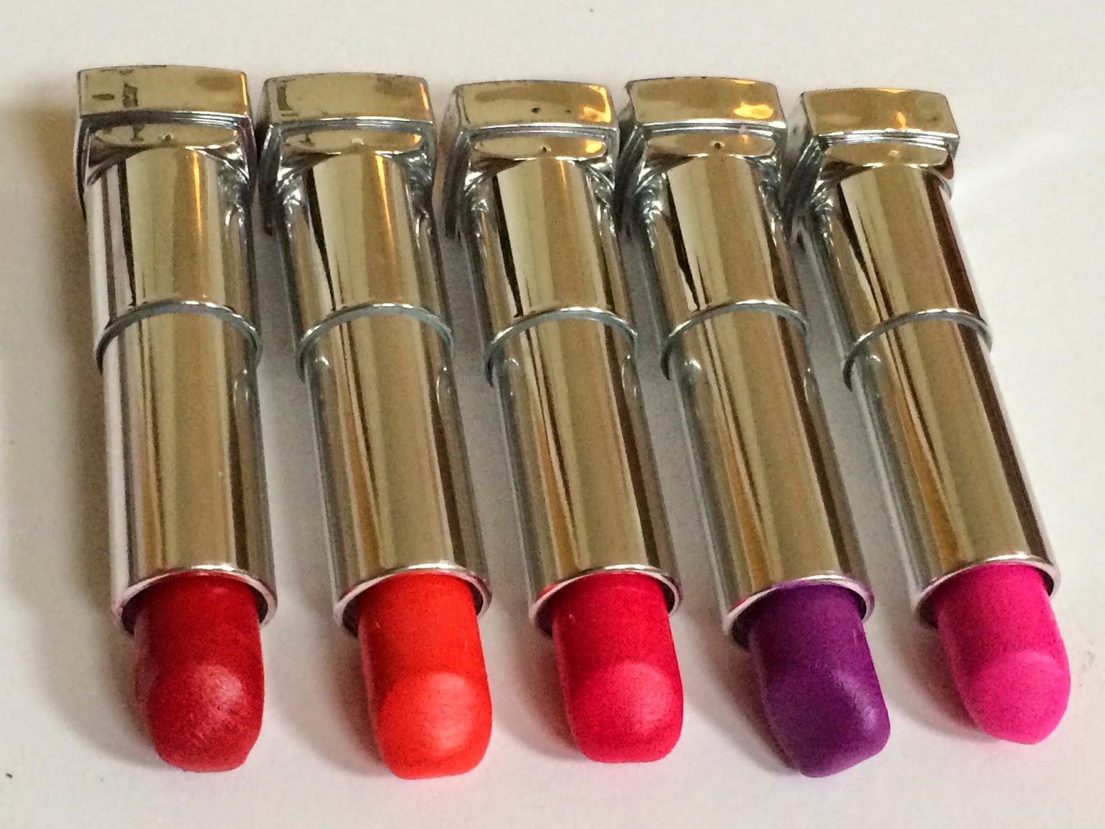 Shades tried (from left): On Fire Red, Vibrant Mandarin, Vivid Rose, Brazen Berry, Fuchsia Flash