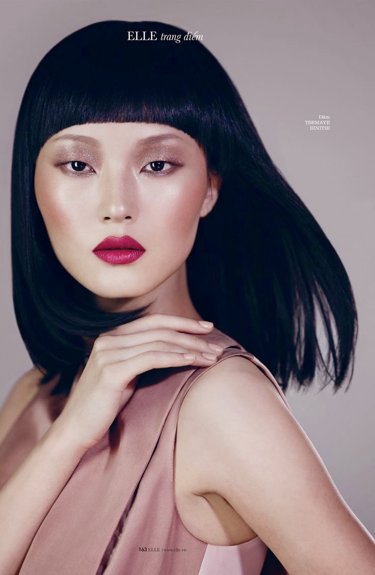 There are a few threads connecting all of these images. The looks are doll-like and conventionally futuristic (metallic eyes, glowing skin, bright cheeks), but with a hint of dishevelment. In the first and last looks, it’s the hair that’s unruly; in the middle two, it’s the makeup (lips in the second, eyes in the third). Compare this aesthetic with the image below, from Elle Vietnam: