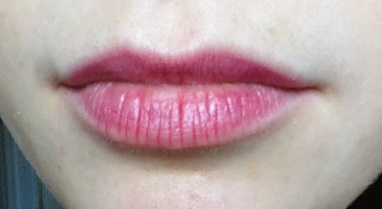 I LOVE THIS COLOR. It’s like a jellied rose. But does it stay vibrant throughout the day? Alas, no. This is just an hour later, after coffee and half a muffin. The color has faded dramatically, but the shine still lingers.