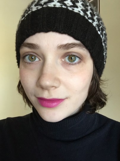Another word of warning: if you often find that lipsticks feather on your lips, you might want to wear Angela over a liner, since it’s so soft and pigmented. It lasts about four hours with drinking but no eating, and the shine wears off quickly, leaving a semi-matte finish. Angela doesn’t withstand a meal (which is fine with me, since I like to remove my lipstick before eating), but it does fade to a bright fuchsia stain, and at the end of the day I have to remove the stain with a washcloth. Here’s Angela freshly applied: