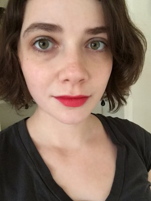 Almost every good thing you’ve heard about the formula is true: Angela is completely opaque in one swipe, yet it doesn’t feel thick, heavy, or slippery. But it is drying after a few hours. If you’ve read this blog for any length of time, you’ll know that I have especially dry lips, and have amassed a collection of lipsticks that mask and cushion the flaky bits. Angela looks great when it’s first applied, but by the end of the day my lips are peeling, as if desperate to rid themselves of any trace of lipstick. This happens even if I wear Angela over balm, and the drying effect lasts a couple of days. Not many reviewers seem to find the Audacious formula uncomfortable, but if your lips are dry or sensitive, I’d advise you to proceed with caution.