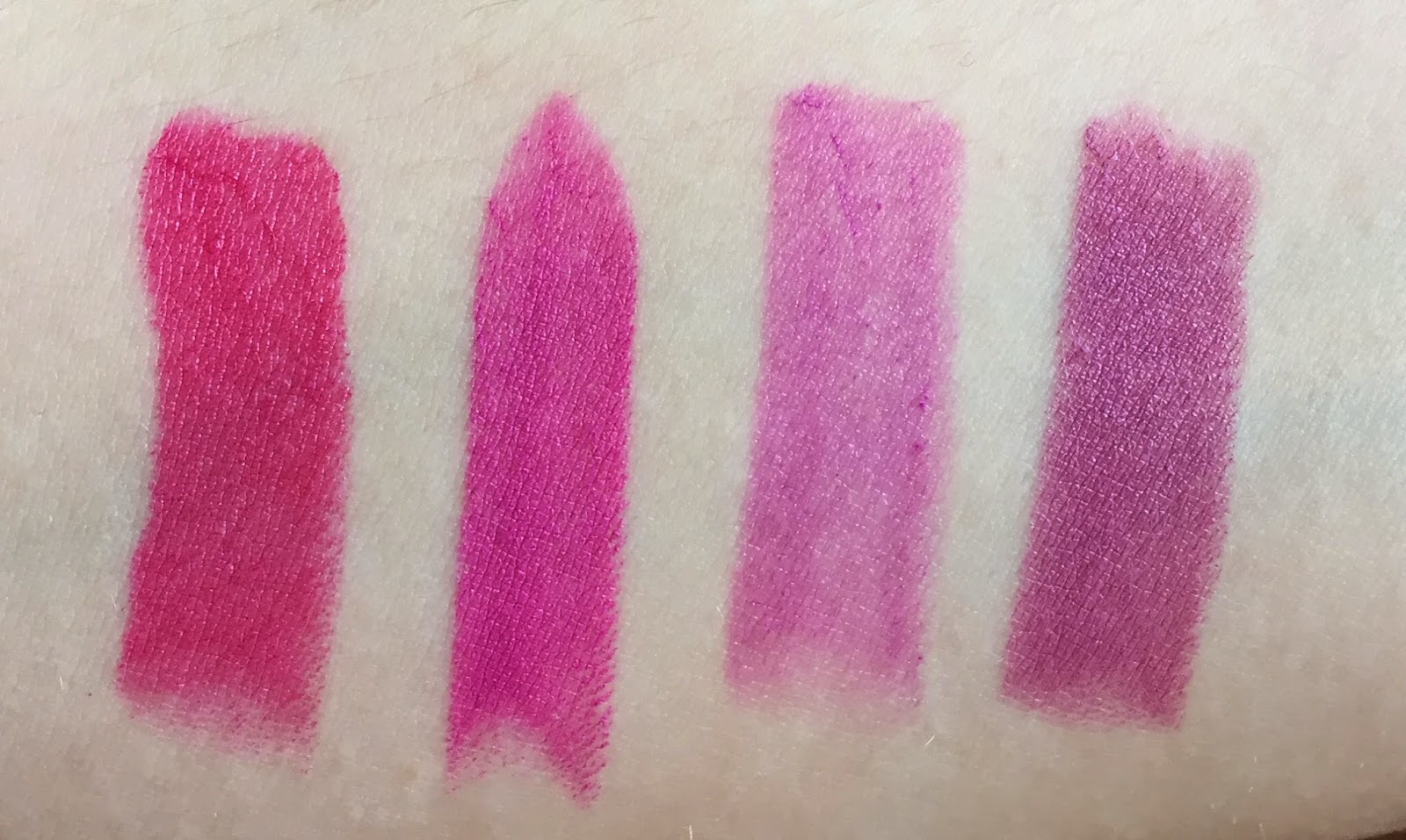 | Left to right: Fuchsia, Angela, Brazen Berry, Up the Amp. |