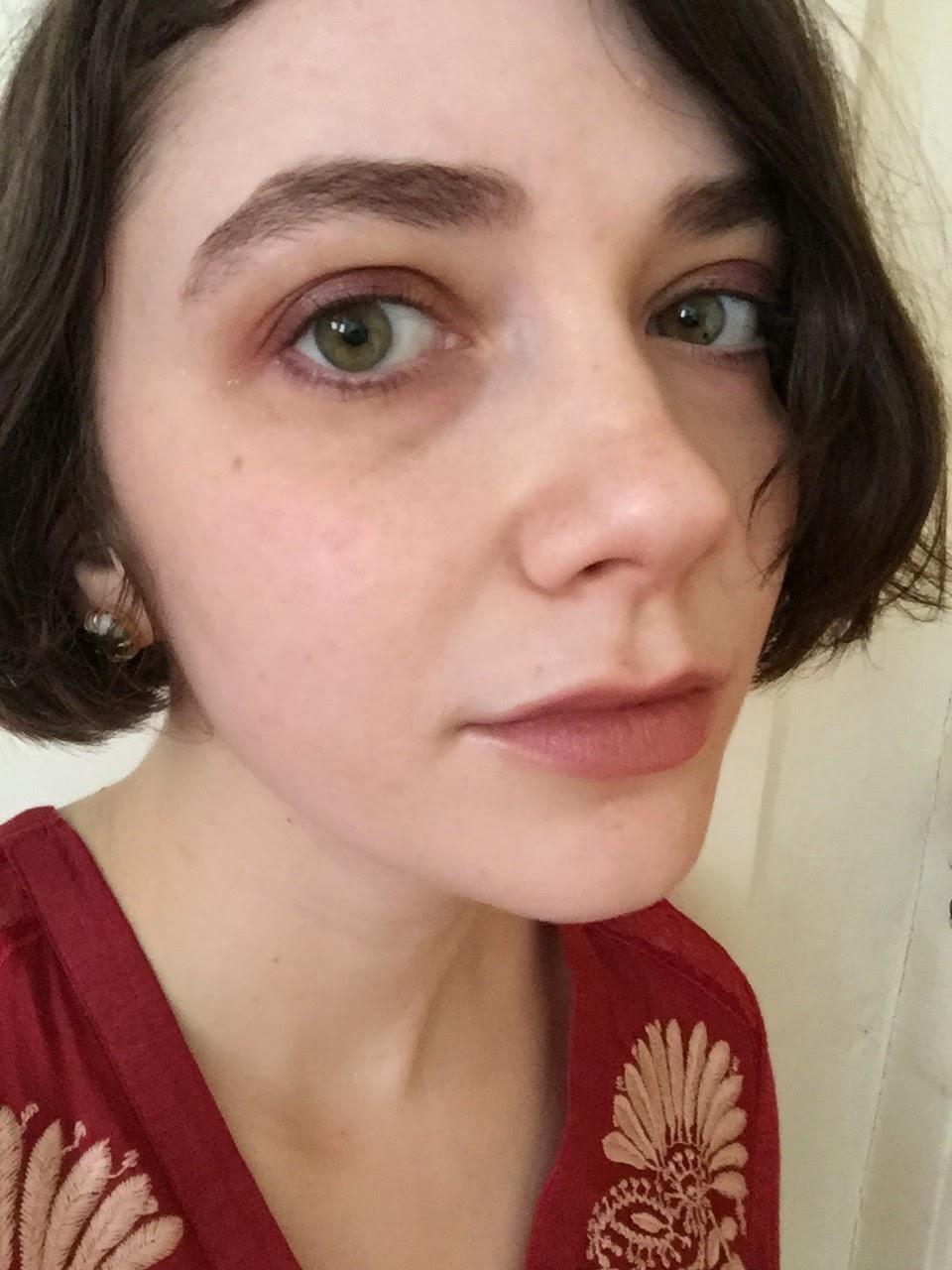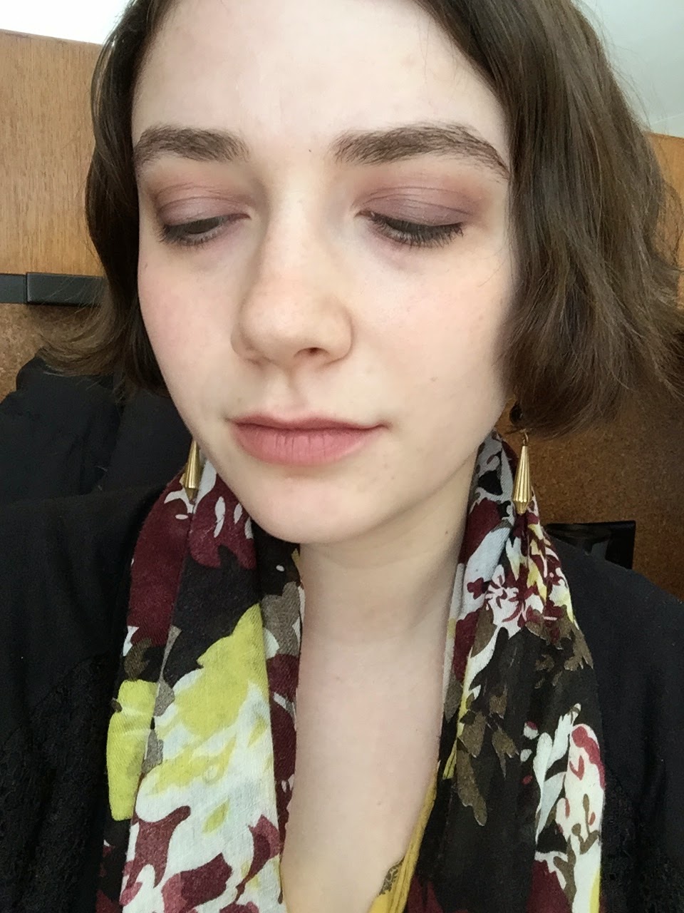 Oh, wait: I was going to tell you how I became a vampire. On the day I wore the first Matte Naked look, I went to the bathroom just before a department event and found a smear of dried blood on my neck. Further inspection revealed two tiny, close-together cuts resembling a vampire bite. I had to run into the department office, clutching a paper towel to my neck, and ask for a bandage. I even looked vampiric, with my reddish eyeshadow and washed-out lips. It was a very strange day.