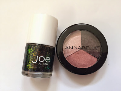 Those of you who commented on my last post seemed to agree that there’s not much difference between Canadian and American beauty offerings, except that Americans have it easier price-wise. By and large, I found this to be true. There’s far more overlap between CVS and Shoppers Drug Mart than there is between, say, CVS and Superdrug or Boots. I did hope to track down some Joe Fresh lipstick or nail polish, but the brand was curiously elusive. It’s sold only in Loblaws and dedicated Joe Fresh stores, neither of which I happened upon during my 48 hours in Toronto. But I got my hands on some Canadian makeup nonetheless: when I met up with Liz for brunch and some beauty shopping, she kindly passed along a bag of goodies that included a few Canadian products, like a Joe Fresh nail polish and an Annabelle eyeshadow trio.
