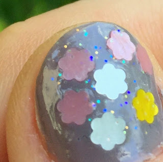 Funny! I've never tried to wrangle giant glitter, myself. In fact, I don't really wear the many regular-size glitters I have, either. But they do look nice in the bottle.It also looks to me like there is orange in that bottle! Is it where the pink and yellow flowers overlap? If I were just to glance at the photo, I'd pick out orange as the dominant color. That's so strange!