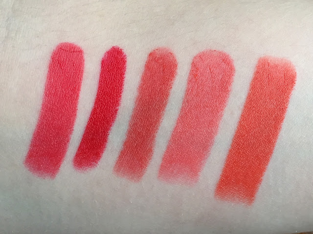 Do I have a dupe of Rio Rio? Depends on how you define “dupe,” I suppose. I don’t think it’s too similar to my older orange-reds, and that’s what counts. Left to right: Revlon Fire & Ice, ColourPop Frenchie, Rio Rio, Maybelline Vibrant Mandarin, Wet n Wild Purty Persimmon.