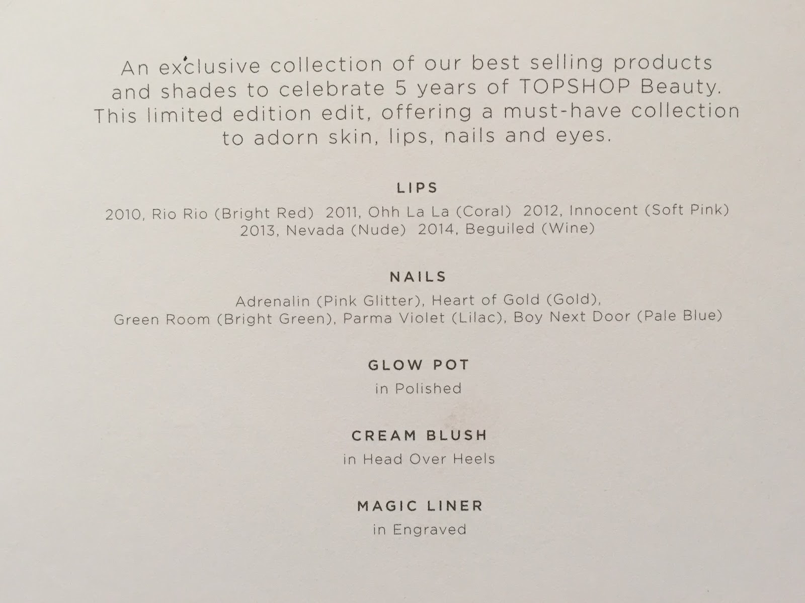 The lipstick in question was orange-red Rio Rio, Topshop’s most famous beauty product, beloved of Liv Tyler and Alexa Chung. Released in 2010, Rio Rio is as iconic as a five-year-old lipstick can be, and Topshop honored its status by making it the cornerstone of the 5 Years of Topshop Beauty collection. Here’s a little leaflet I picked up at the store: