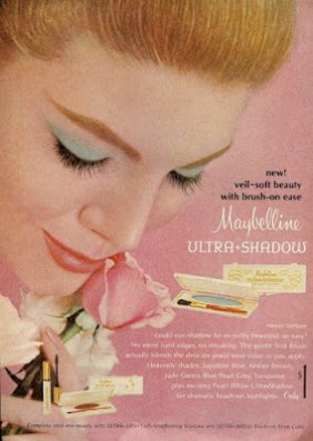 21st-century interpretations of mod eye makeup tend to involve thick, graphic strokes of black liquid liner, as seen in the vintage Max Factor ad above (source). But it doesn’t have to be this way! A Maybelline ad from 1965 (source) shows a softer, subtler look that I prefer, not least because my extra eyelid crease makes sharp cat-eye flicks pretty much impossible.