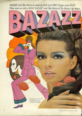 This Max Factor ad from 1966 (source) features a cross between a teal smoky eye and a graphic pastel eye; note the lack of black flicks at the outer corners, though the pale blue is winged out past the eyebrows. I don’t know what’s going on in the background, but I’m into it. BAZAZZ!