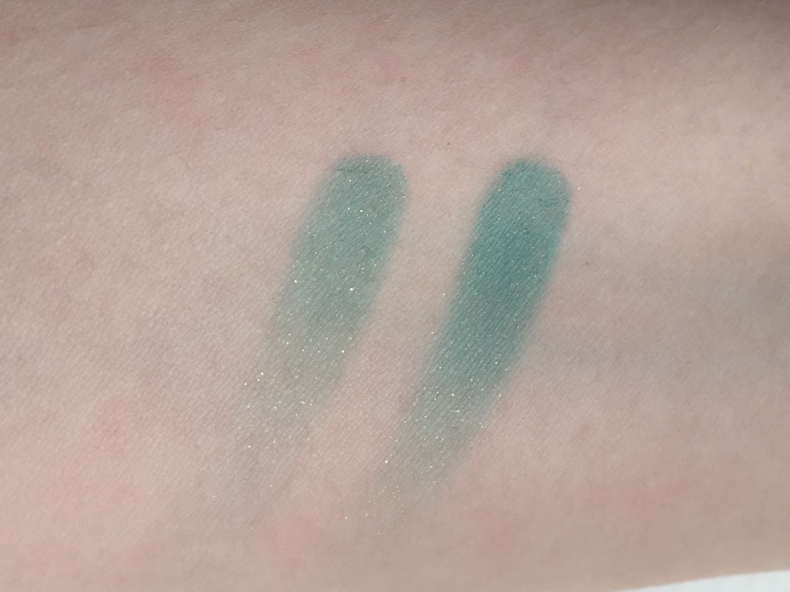 I was very happy with the two Kiko eyeshadows I bought last year, and 264 is equally impressive. It has the same smooth, non-powdery formula as 270, the shimmery olive green, though it’s slightly less pigmented. This is fine with me, as I like being able to build up pigment gradually on my lids, especially with a bright color like teal. I’ve swatched 264 below: one pass on the left, and two on the right. As you can see, the glitter becomes less evident as you build up the color.