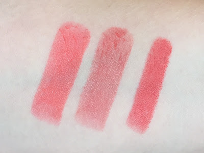 Here it is swatched between Maybelline Vibrant Mandarin (left) and Topshop Rio Rio (right). See how Vibrant Mandarin has a bright white base that Candy Apple and Rio Rio lack? Also, this photo makes me realize that CA isn’t that much sheerer than VM, which is not marketed as a sheer lipstick…