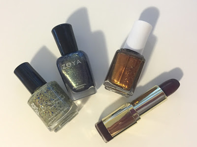 | L-R: KBShimmer Open Toad Shoes, Zoya Fei Fei, Essie Leggy Legend, Milani Matte Fearless. |