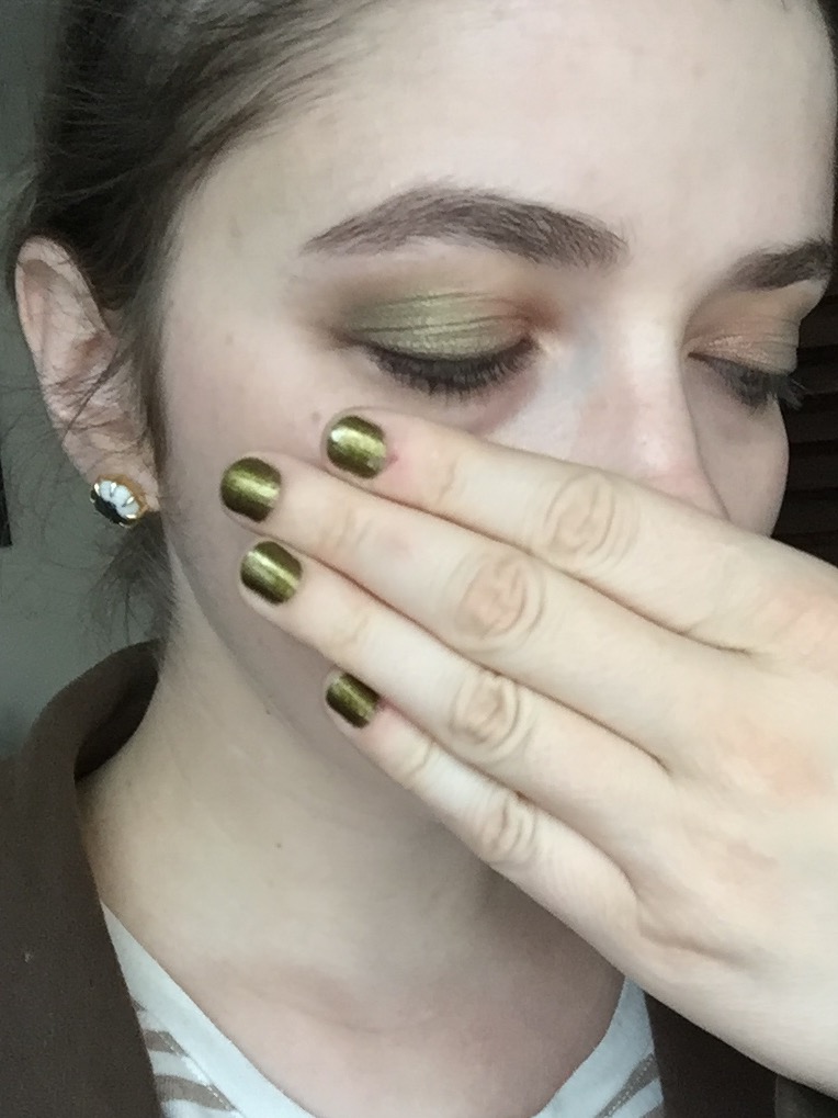 I was very pleased to note that the green eyeshadow was a near-perfect match for my nail polish, Butter London Wallis. I used to refer to Wallis as “the official nail polish of Slytherin House,” but a recent conversation with a grad-school friend (also sorted by Pottermore into Slytherin, don’t you know) has me thinking that NARS Night Porter might be worthier of that distinction. Wallis is a formidable contender, though.