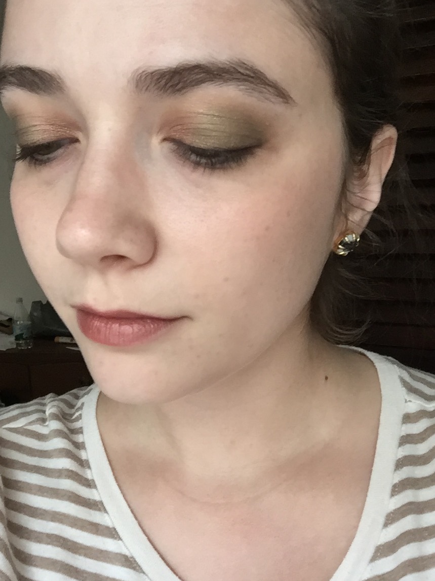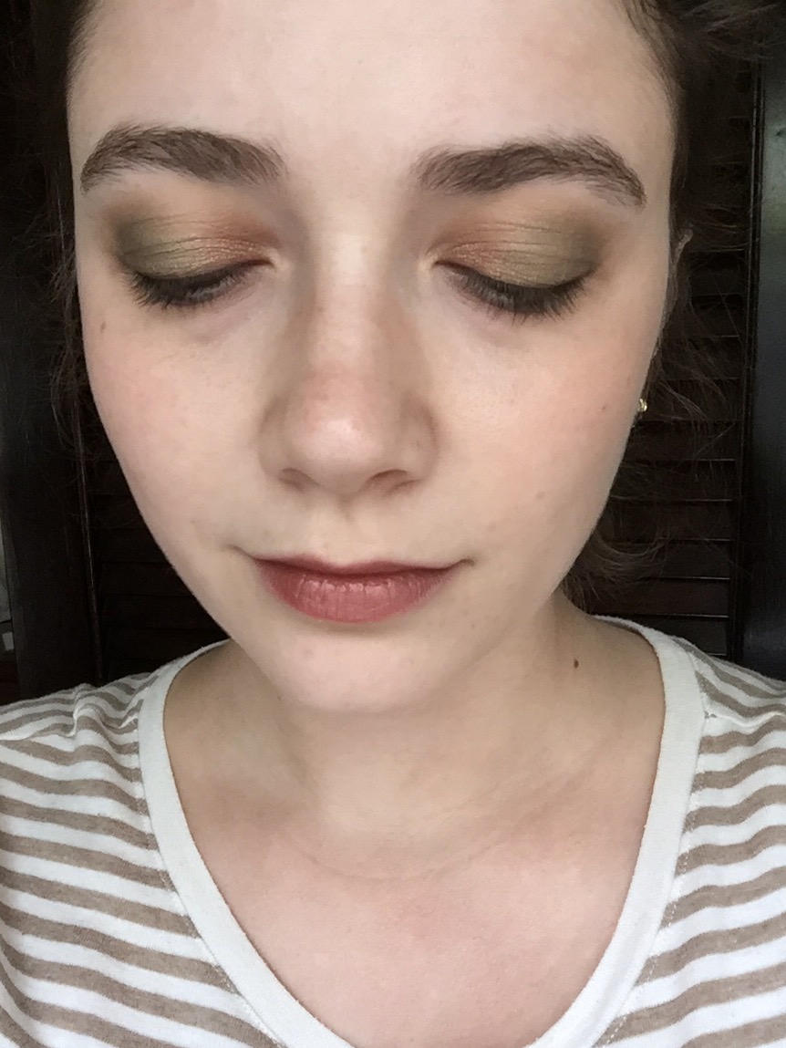 For my shamelessly obvious autumn-leaves look, I used the copper and the green. I’d like to claim credit for this color combination, but I based it loosely on the NARS Blade Runner duo, reviewed by Kate at More Like Space here. I swear I’ve bought half my eyeshadows in semi-conscious attempts to dupe NARS duos. This particular dupe attempt is very different from the original—Blade Runner’s green is darker than theBalm’s, and its copper is much pinker—but Blade Runner is long discontinued, so this is the best I’m going to do for now.