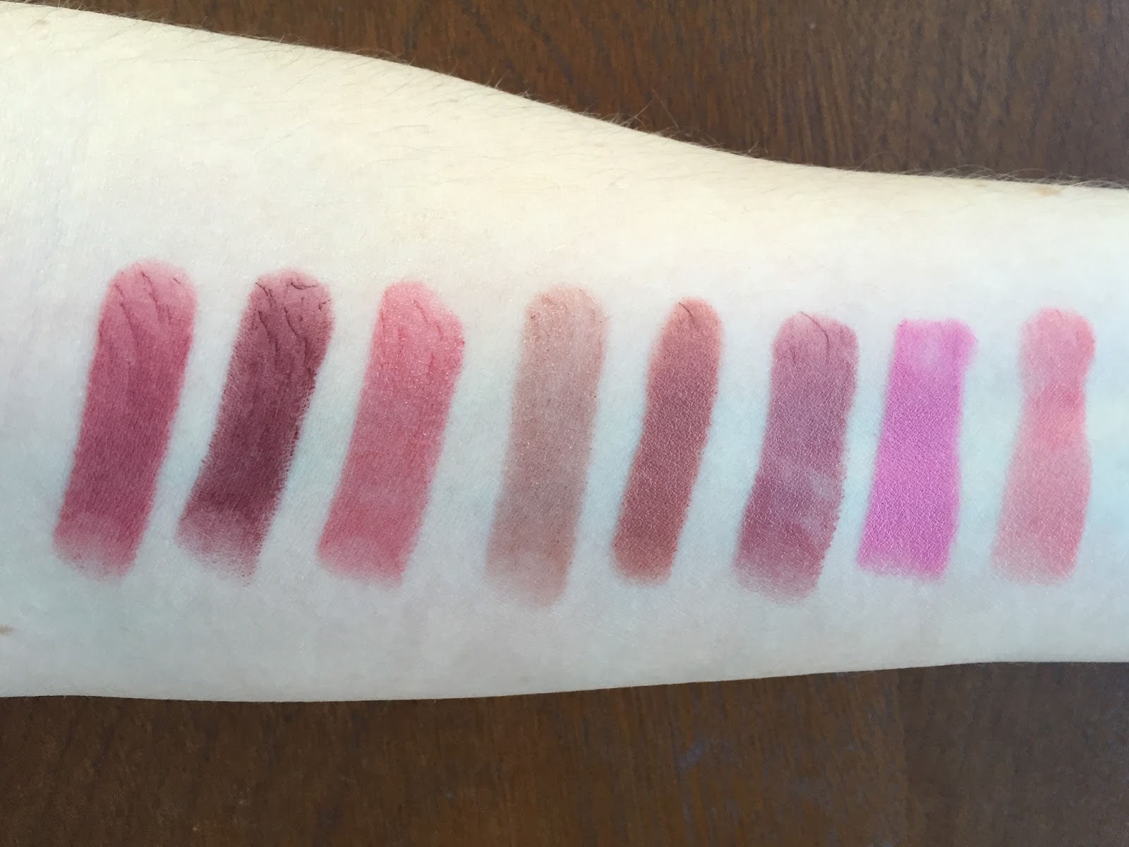At the same time, I don’t like wearing “no-makeup makeup” (or, you know, no makeup) while teaching. I’ve always looked fairly young for my age, and the less makeup I wear, the younger I look. I find that lipstick in particular helps me appear more mature, since none of my students wear it (some do wear eye makeup, however). So my favorite teaching lipsticks are not screaming fuchsias, but they’re not sheer nudes, either. Anything in the plum/rose range works, and there are a couple of clear pinks that I’ll wear in spring as well. Here’s a sampling of the lipstick shades I’m most likely to wear in class: