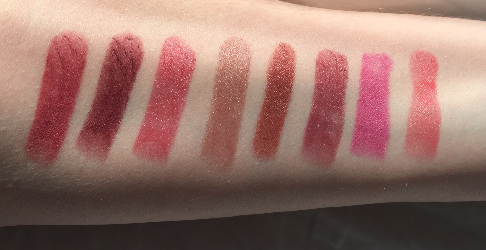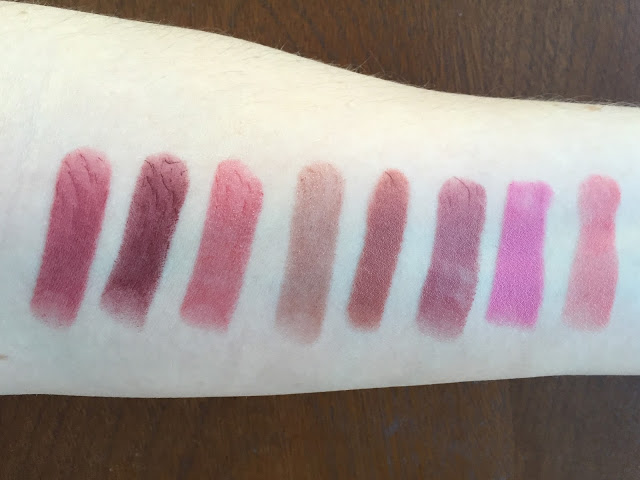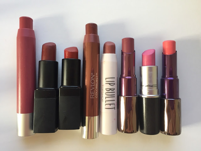 Left to right: Revlon Matte Balm in Sultry, NARS Semi-Matte Lipstick in 413 BLKR, NARS Sheer Lipstick in Flamenco, Revlon Lacquer Balm in Coy, Topshop Lip Bullet in Motel, Urban Decay Revolution Lipstick in Rapture, MAC Satin Lipstick in Pink Nouveau, Urban Decay Revolution Lipstick in Streak. It gives me a lot of satisfaction to see how well-loved these shades are.