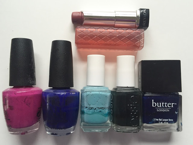 I hate to get rid of the nail polishes, all of which were favorites of mine, but four of them are almost completely dried up. The fifth, Essie Stylenomics, stained the hell out of my nails last fall, and it took months for them to recover completely. I just can’t see myself wearing Stylenomics again, as much as I love that severe dark green. Royal Navy was my first Butter London, by the way—I bought it in June 2012.