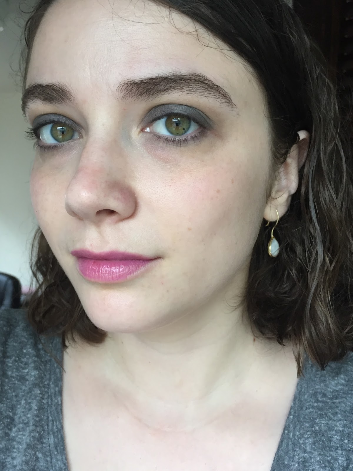 Here it is on my face—I generally pair it with boring understated makeup for my low-maintenance days. The sheen has faded a bit here: