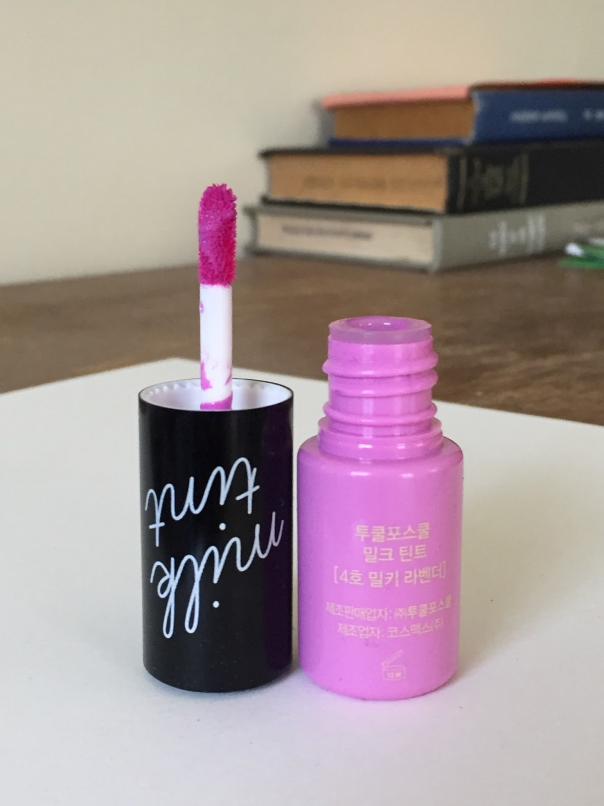 I don’t think it’s possible to be a lipstick-loving k-pop fan without developing a curiosity about Korean lip tints. I’d had my eye out for a tint since last year, but most of the tints available in the US seemed to come in very bright colors (orange and pink being the most popular) and watery, ultra-staining formulas that I knew would dry the hell out of my lips. By the time I visited oo35mm, a deceptively tiny store in New York’s Chinatown with an impressive selection of Asian (mostly Korean and Japanese) beauty products, I’d pretty much given up on finding a relatively non-drying lip tint in my preferred purply color family. I was actually at oo35mm for skincare: I wanted a Salux exfoliating body washcloth, which I’d read about in this Into the Gloss post (see, I do like ITG sometimes), as well as some sheet masks from brands I hadn’t yet tried. But when I saw the Too Cool for School display, with its array of pastel lip tints in cardboard milk cartons holy shit, it was all over for me.
