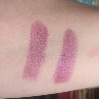 Like many an old-school vampy lipstick, Violet Frenzy lacks in opacity. It’s a dark reddish purple with silver pearl, and it looks very dramatic in the tube, but swatches tell another story. Here’s one swipe on the left and three on the right: