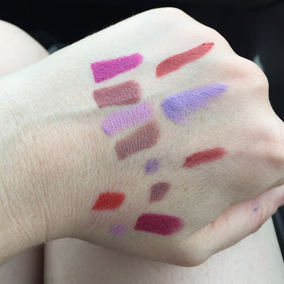 The reddish orange at bottom left is Urban Decay Temper. Left row, top to bottom: Urban Decay Crank (a dead ringer for NARS Angela), Backtalk, Vanity Kills, Oblivion, ignore those two tiny swatches, After Dark. Right row, top to bottom: Kat Von D Chula, Coven, Lolita (?). I tried on Vanity Kills, but it looked terrible. The name of that lipstick is apt: I need to stop immolating myself on the altar of white-based pastels.