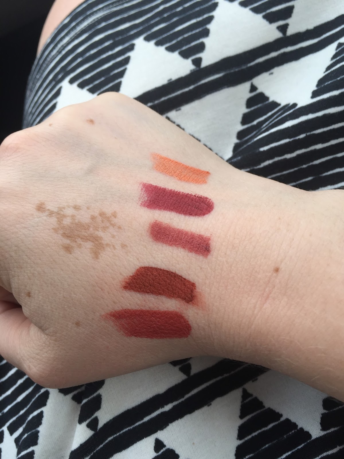 Here we have three rusty oranges, one rusty non-orange, and one non-rusty orange. Top to bottom: Kat Von D Solo (I can’t imagine a complexion this shimmery nacho-cheese shade would flatter, but what do I know?), Kat Von D Archangel (?), Urban Decay Hitch Hike, Smashbox Always On liquid lipstick in Out Loud, Kat Von D Chula. Of these five, Out Loud is closest to my platonic rusty orange, but it’s a little too brown. I still think MAC Chili is a better match.