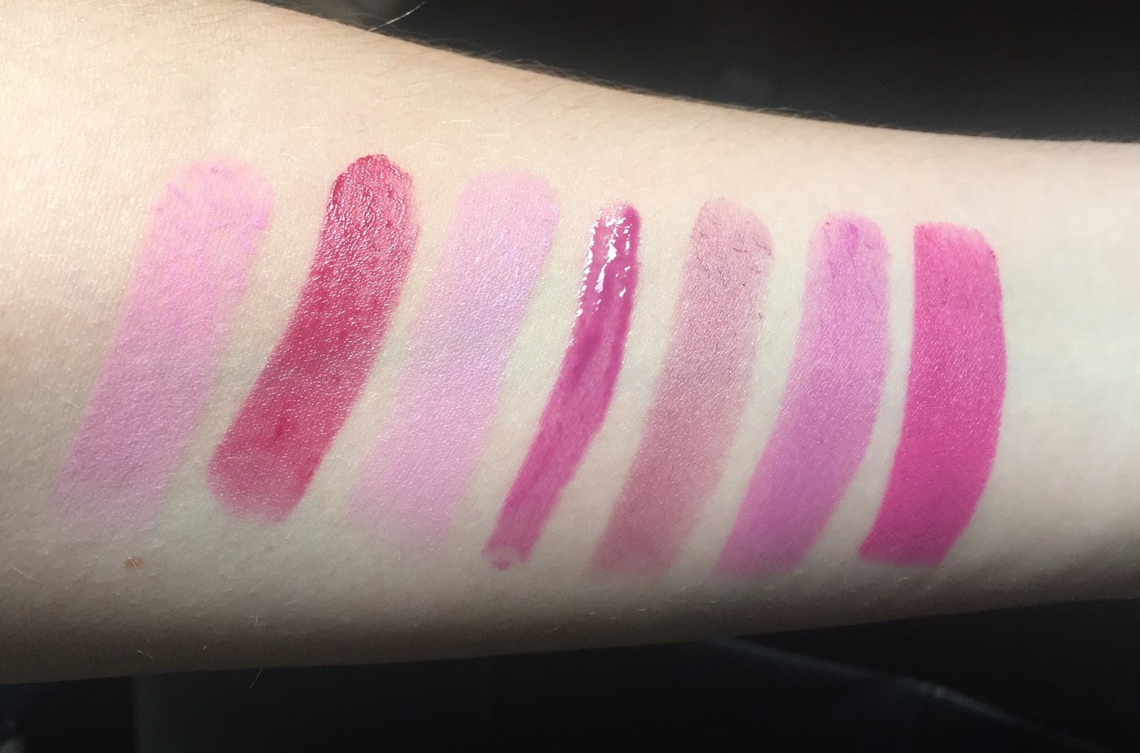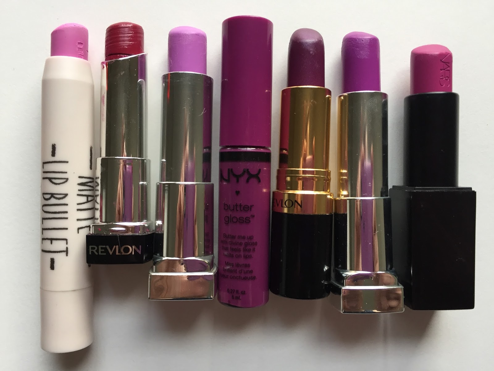 | L-R: Topshop Plastique, Revlon Raspberry Pie, Maybelline Lilac Flush, NYX Raspberry Tart, Revlon Violet Frenzy, Maybelline Brazen Berry, NARS Angela. |